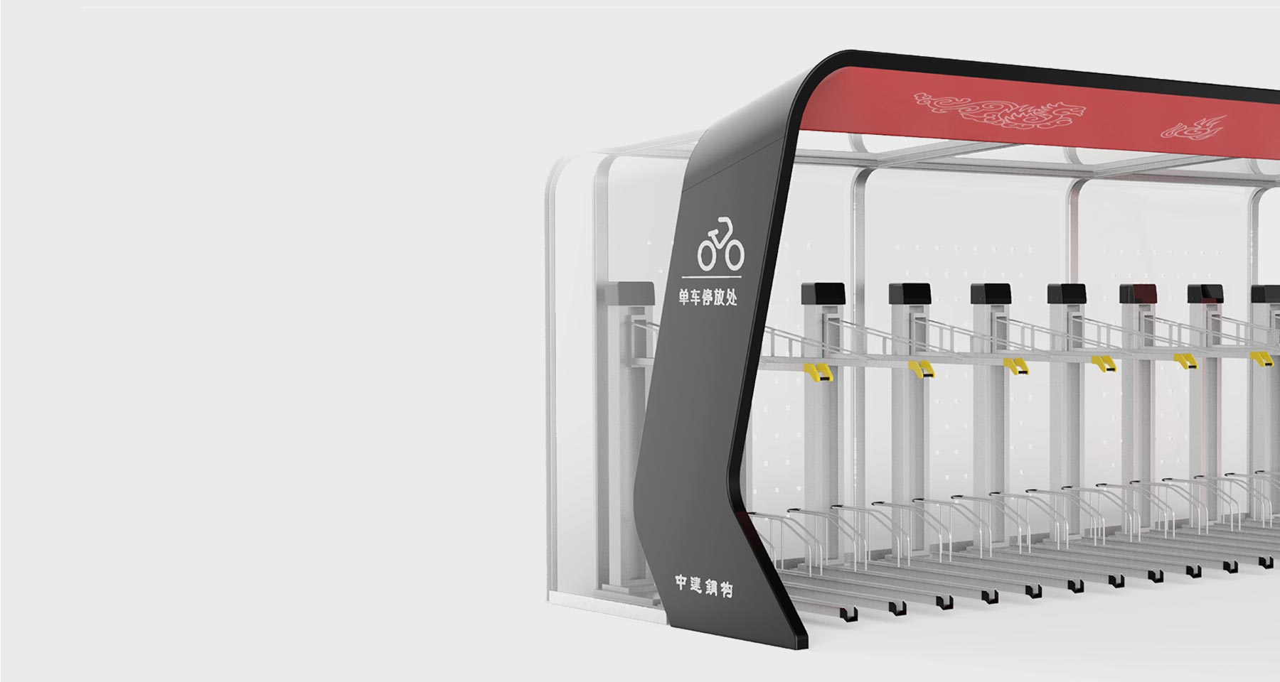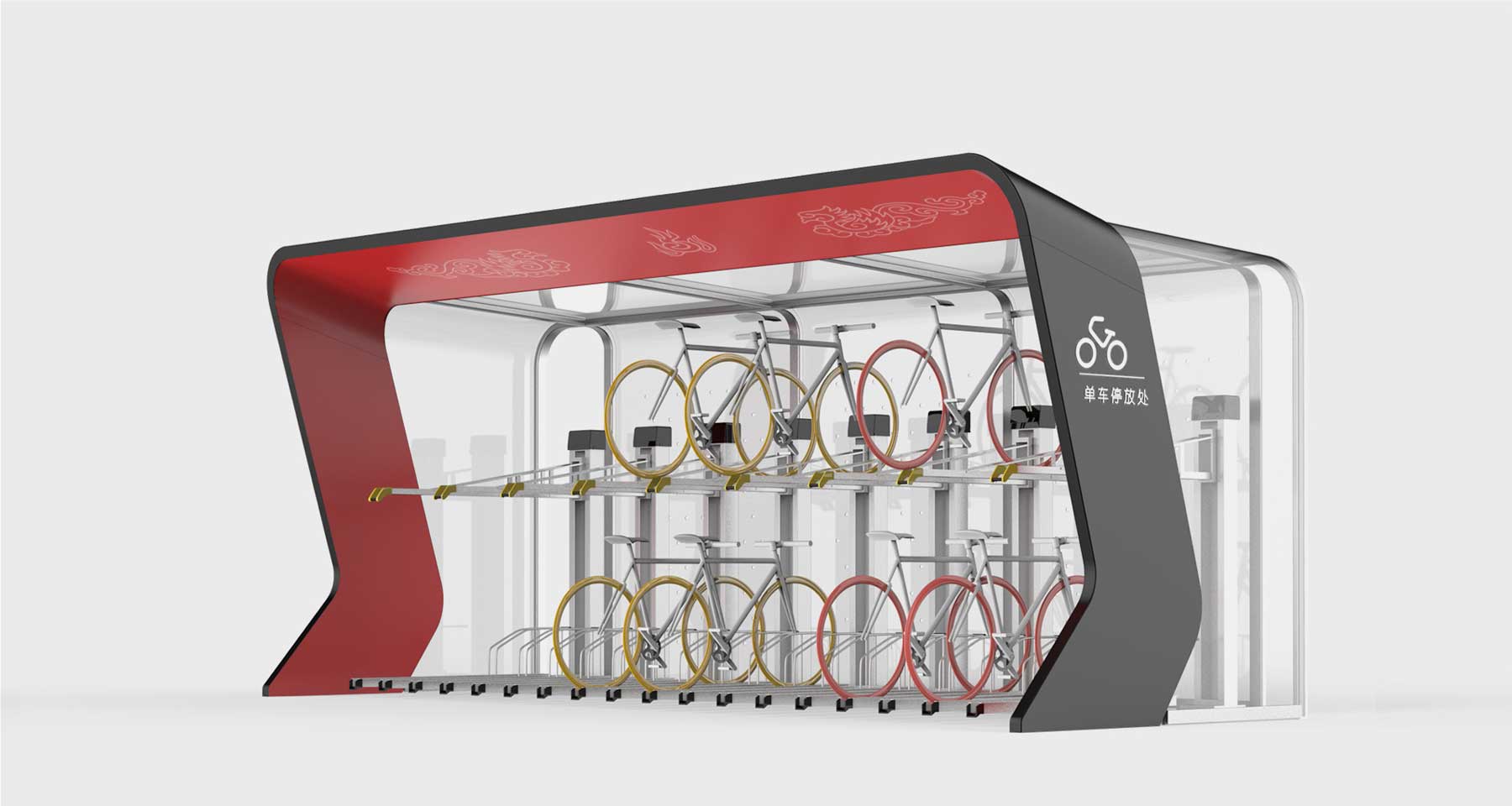 双层立体自行车库是成都市政府与中国最大的钢结构公司中建钢构合作规划并委托木马设计的一款产品,基于成都市经济与文化的迅速发展,以及城市发展所面临的环境与规划问题,双方意在推出一款能改变共享单车停放乱现状的产品。木马通过对成都市的文化背景研究,提出了川剧脸谱的概念,得到了成都市政府的高度认同。 产品抽象化川剧脸谱装扮的帽檐,以及帽檐两侧的缎带,再将其重新结合为车库的外形,并辅以传统的二龙戏珠图腾,增加其文化寓意。将城市传统文化与现代化生活联系,增强了城市现代化进程中年轻用户群体的文化认同,同时也成为城市展示自己的一个有力的文化符号。